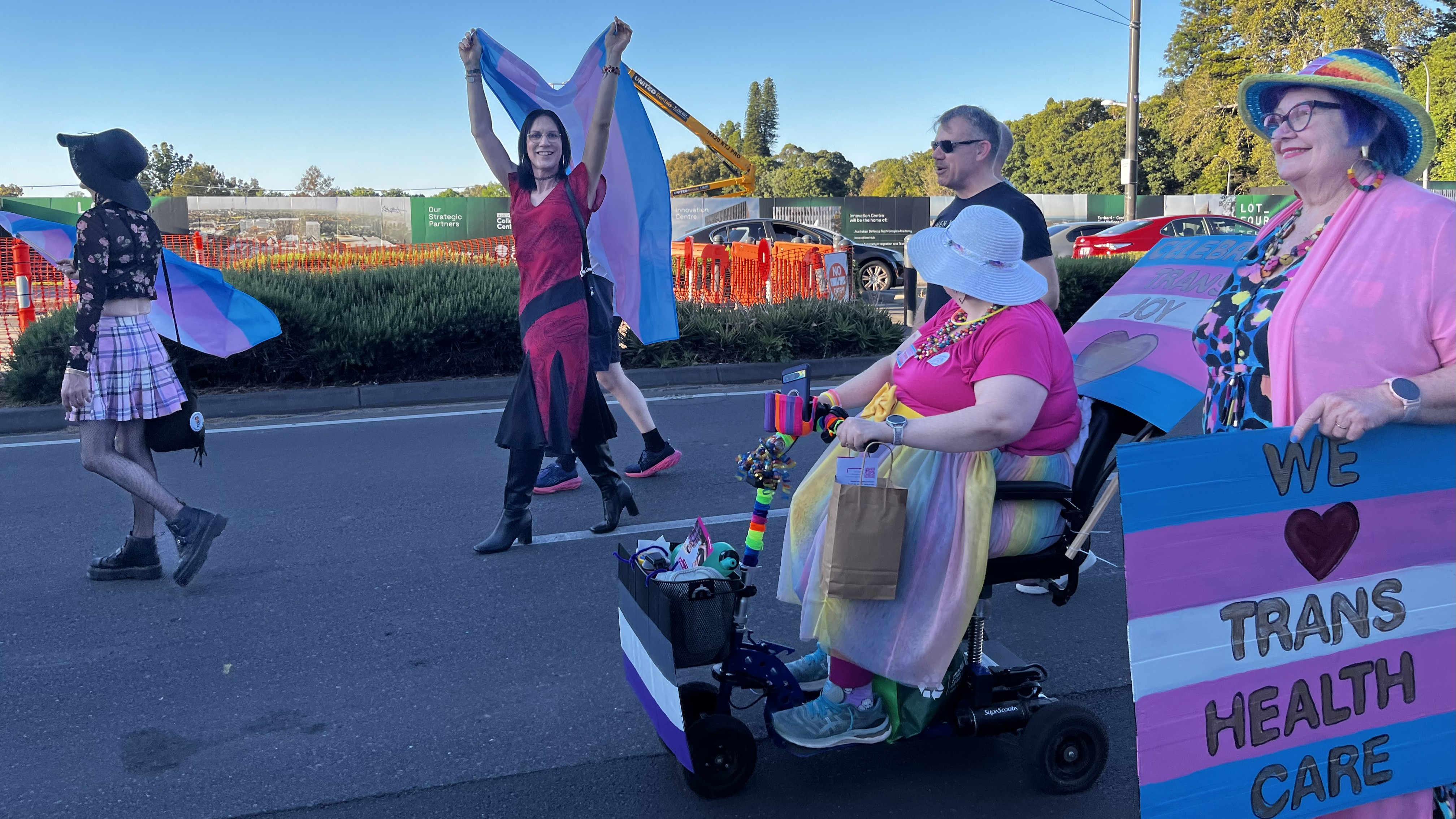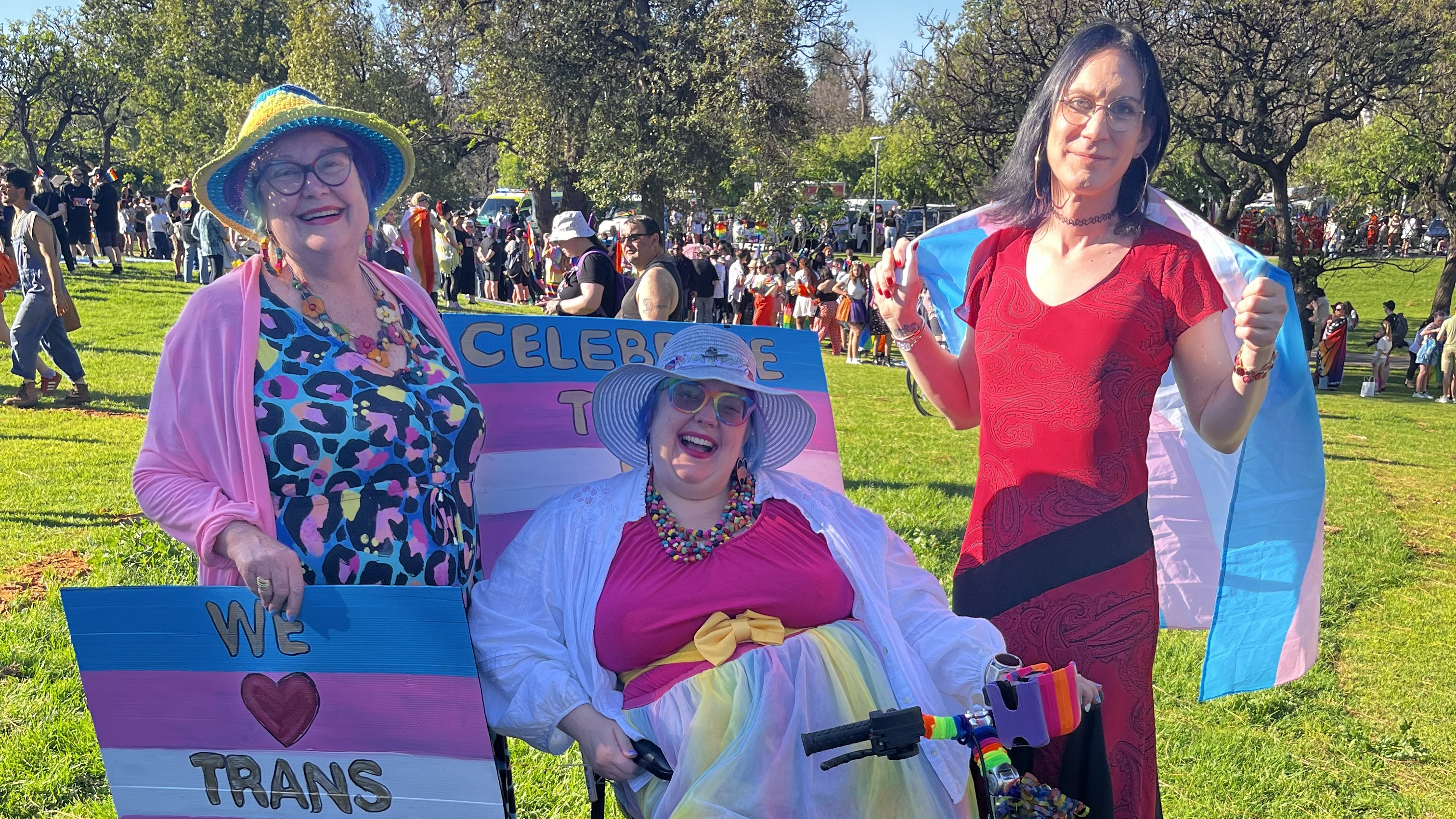 Image: Jenny, Ceara and Ariel holding the Trans Pride flag and signs, smiling at the camera.