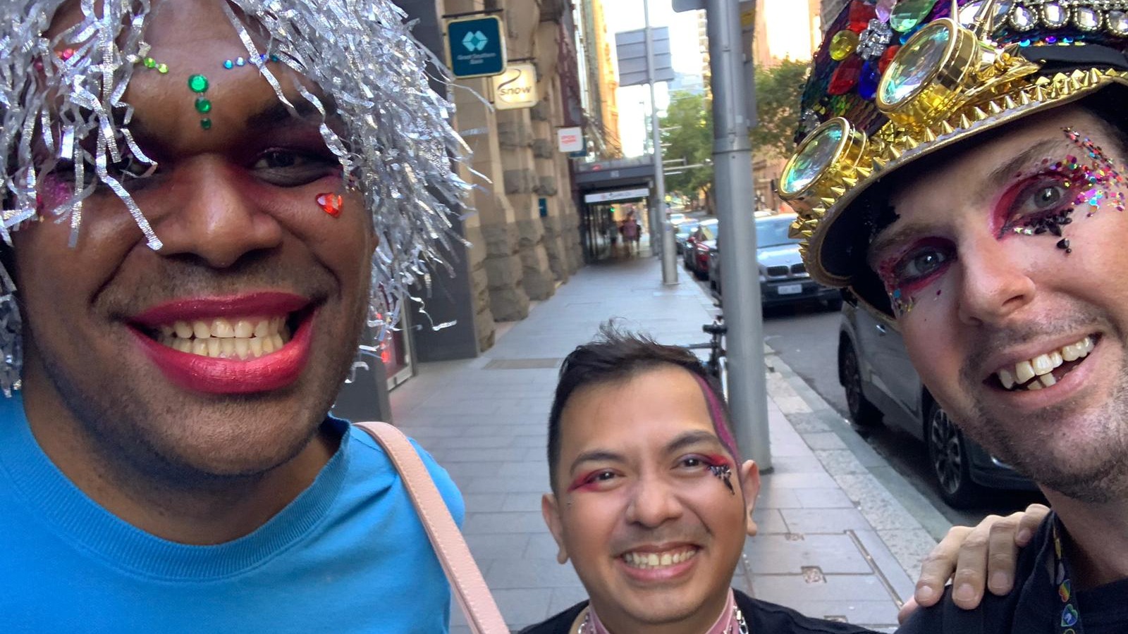 Image: Three men pose for a photo together. One wears a blue t-shirt and a glittery wig. The other two men are wearing black t-shirts with glittery accessories and eye make up.