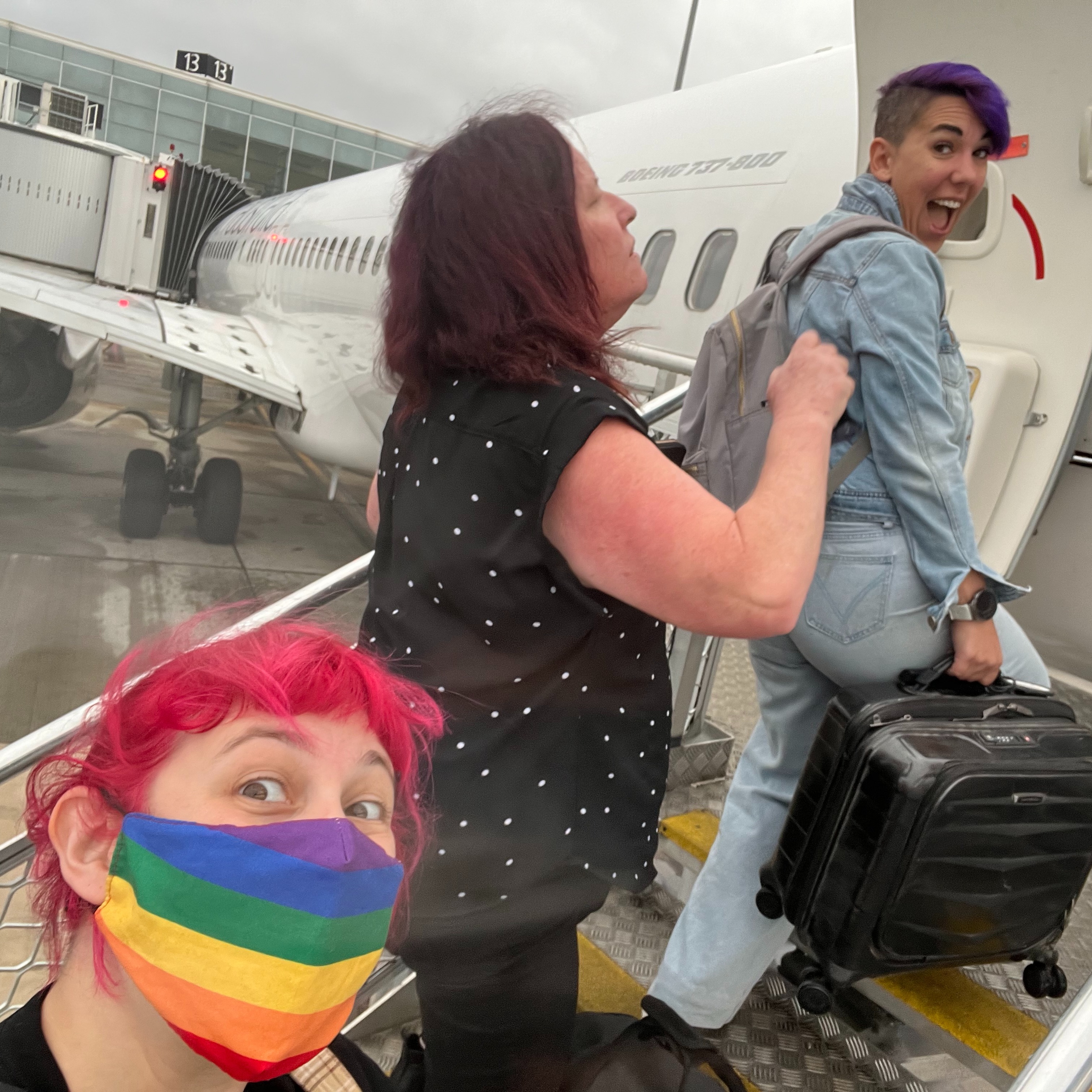 Image: Phi, with pink hair and wearing a rainbow facemask, boards a plane with two women walking up the stairs behind her. One is holding a suitcase and smiling at the camera.