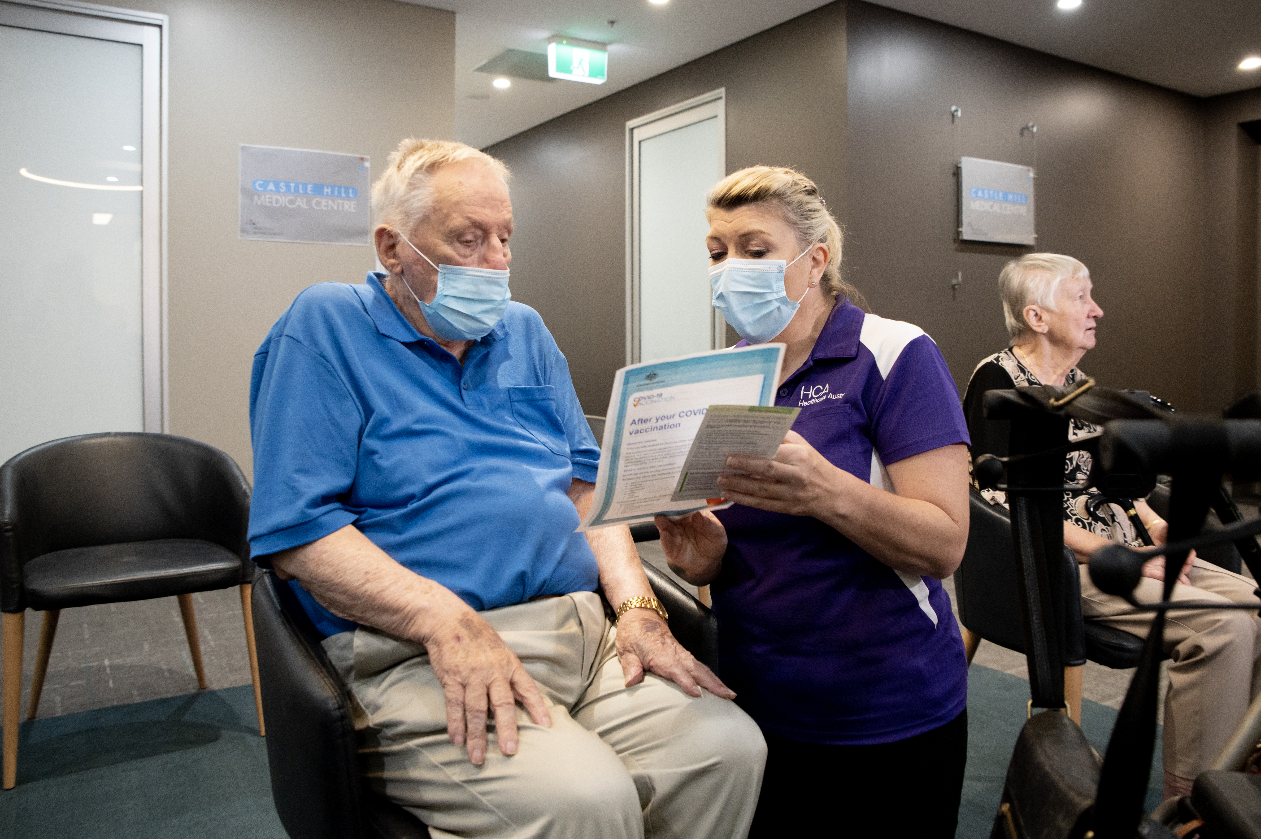 Image: An older gentlemen being shown the information about the COVID19 vaccine in a covid hub.