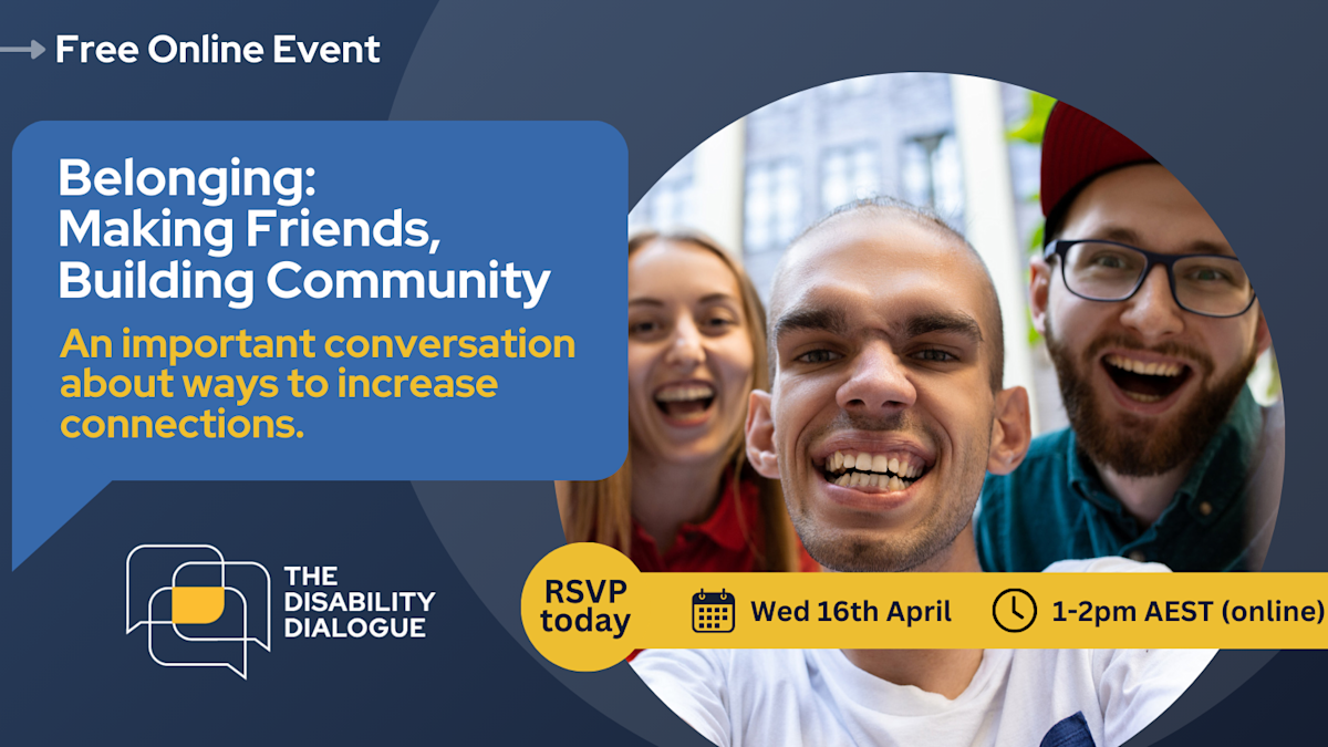 Image: Graphic tile with an image of three people smiling at the camera. Text: Free Online Event. Belonging: Making Friends, Building Community. An important conversation about ways to increase connections. RSVP Today. Wed 16th April. 1-2pm AEST (online). The Disability Dialogue - Logo.