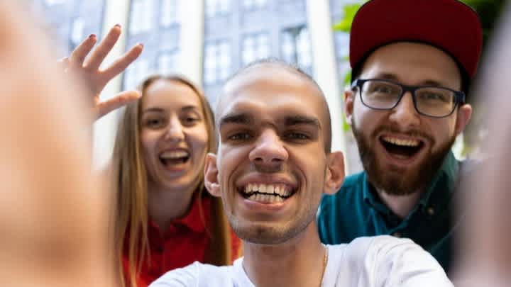 Image: Three people looking at the camera taking a selfie, they are all smiling.