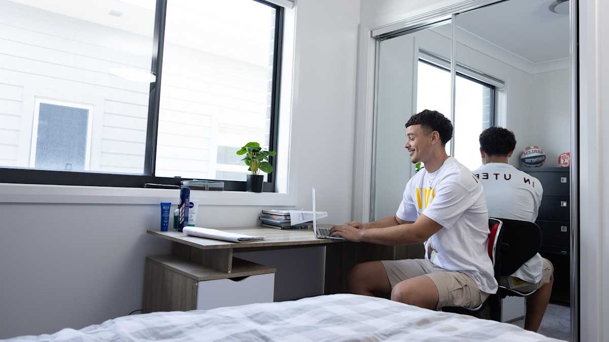Image: A teenage boy sitting at a desk, typing on a laptop.