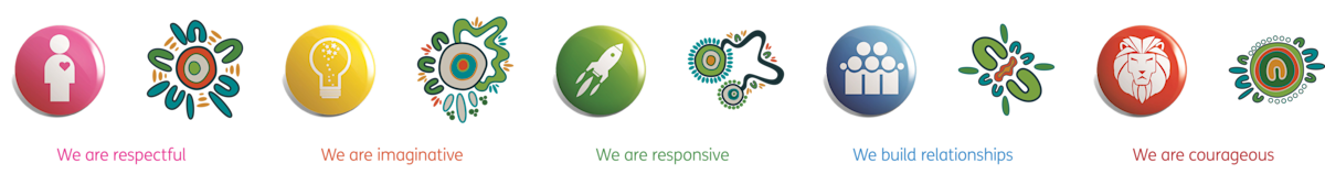 Image: Ten icons with the words 'we are respectful' 'we are imaginative' 'we are responsive' 'we build relationships' and 'we are courageous' underneath.