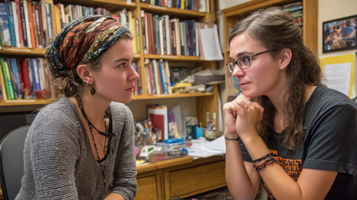 Image: Two women are sitting close to each other and speaking. They are in an office setting with books in the background.