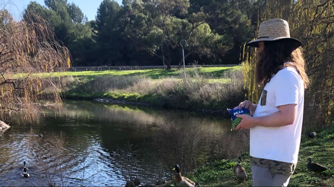 Image: Bobby, pictured at a park in South Australia, standing by a lake looking at the ducks.