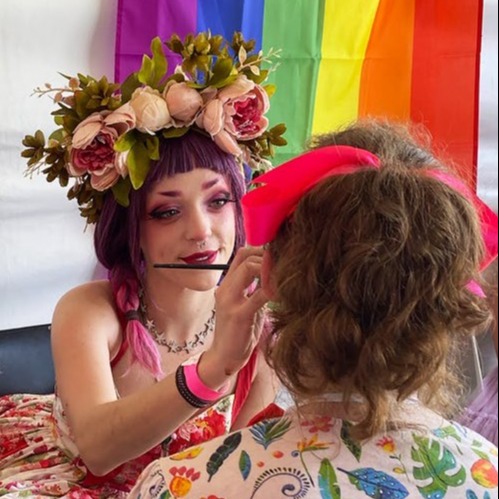 Image: An individual with purple and pink hair, wearing a flower crown, sits in front of a pride flag, painting a child's face.