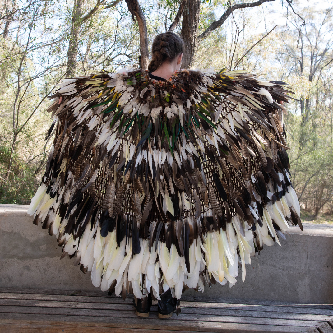 Image: Back of young person with arms outstretched wearing a cloak of feathers. The cloak is mainly made of rows of brown, black and white feathers.