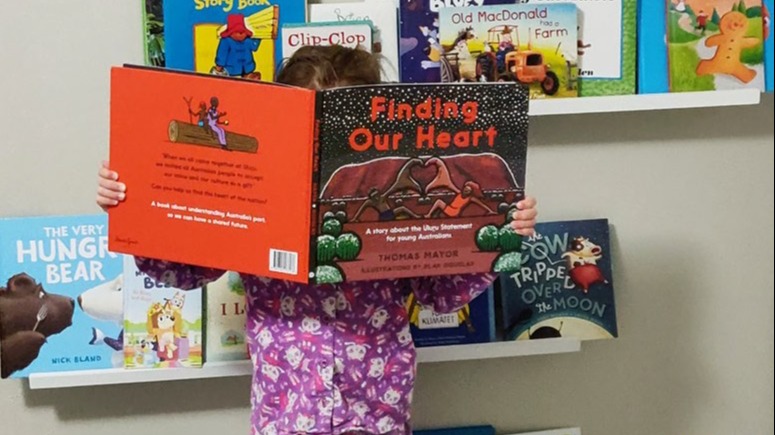 Image: A child standing in front of a book shelf, wearing pyjamas and holding the book 'Finding Our Heart' over their face.