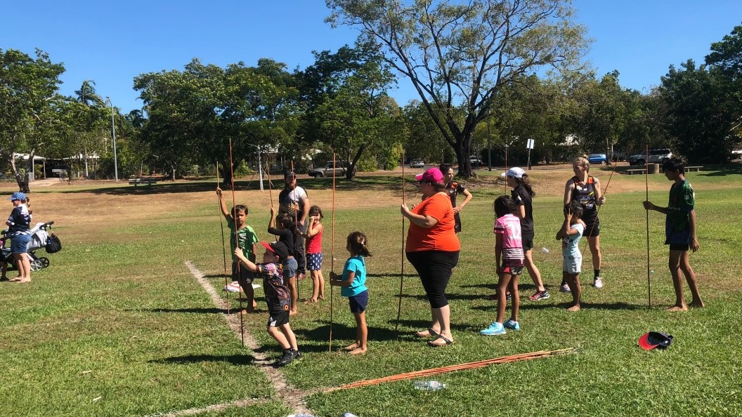 Image: Clients and their families participate in Pudakul (Spear Throwing) and other culture activities at the NAIDOC Sports Day in Darwin