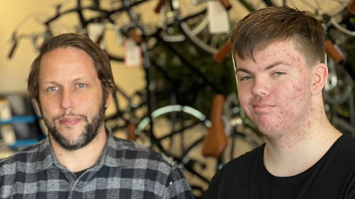 Image: Quinn and Rob at Tempest Bike Shop, standing side by side and smiling at the camera.