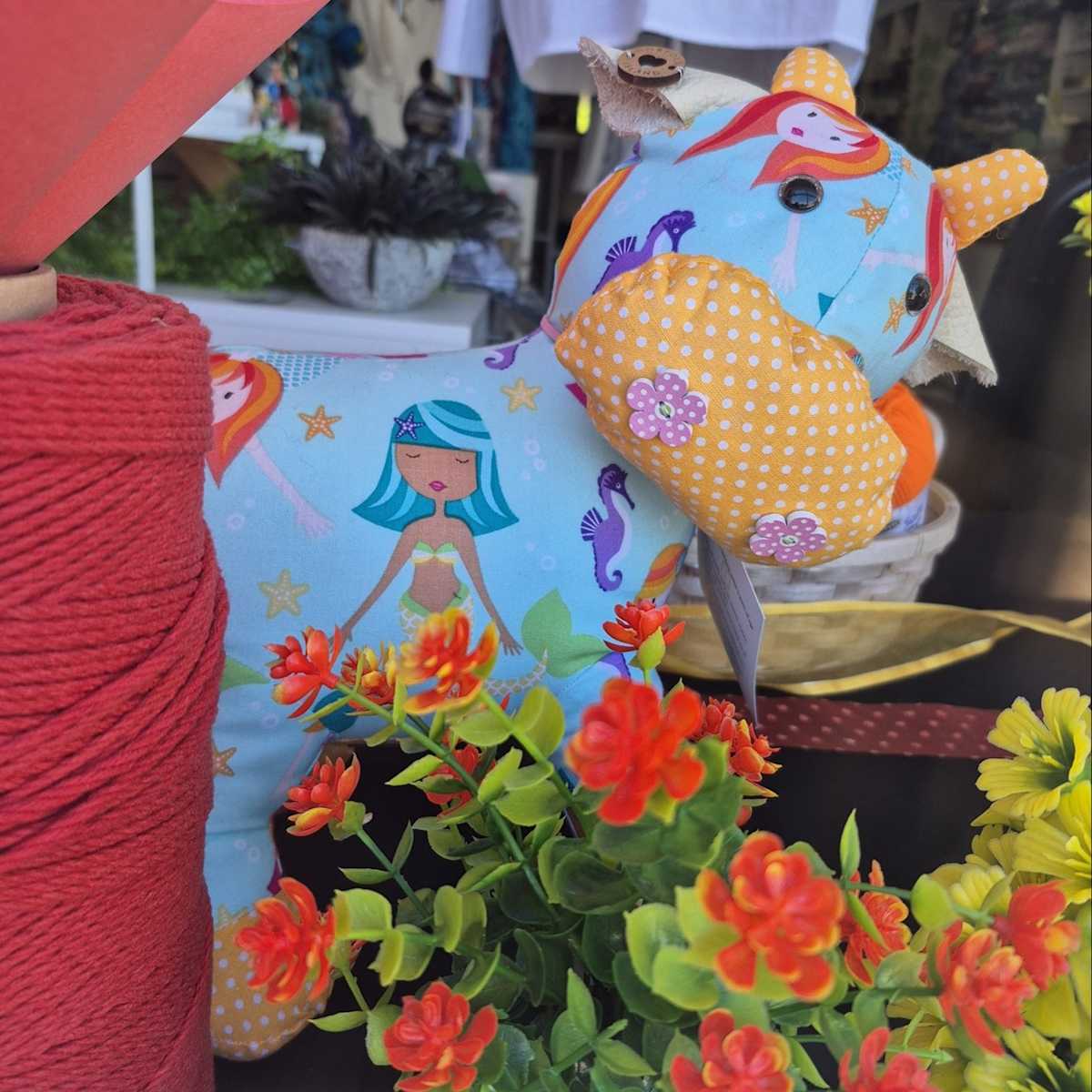 Image: Close-up of a patchwork cow soft toy featured in Sacha's window display.