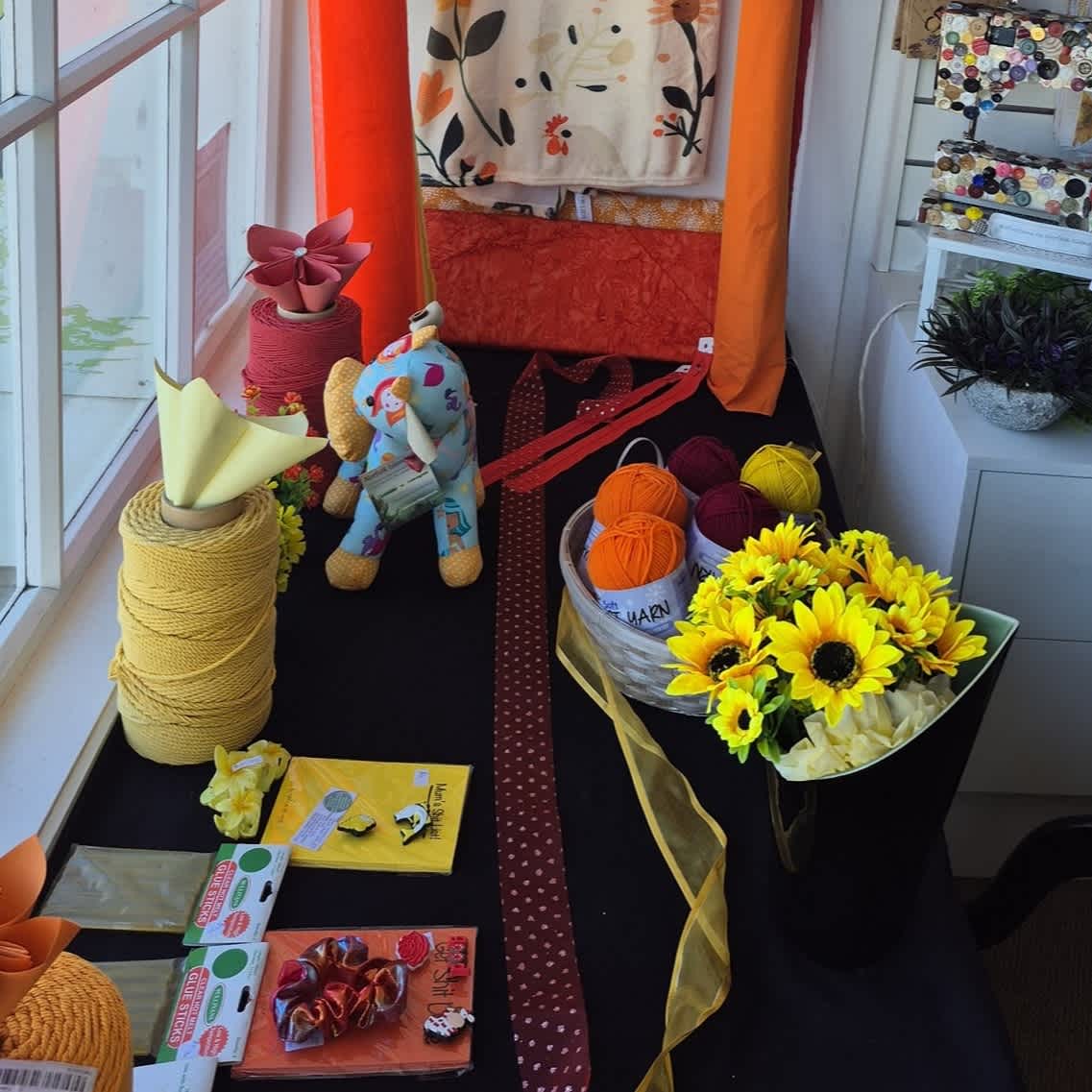 Image: Sacha's Autumn window display at Reflections, featuring a mix of orange, yellow and red items.