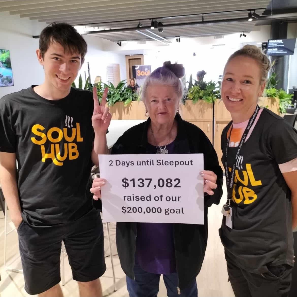Image: Sam, wearing a black Soul Hub T-shirt, stands with two women, smiling at the camera. The woman in the middle, Rebecca, holds up a sign which says: 2 Days until Sleepout. $137,082 raised of our $200,00 goal.