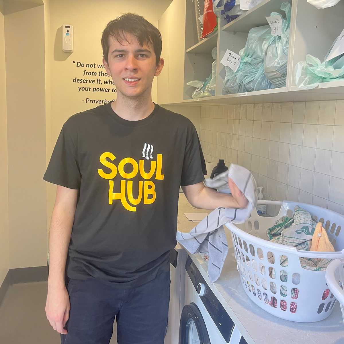 Image: Sam wears a black T-shirt with the Soul Hub logo on it, smiling at the camera.