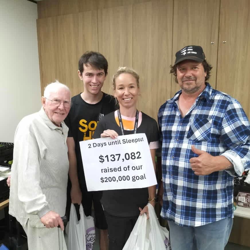 Image: Sam stands in a group with three people, smiling at the camera. The woman in the middle holds up a sign which says: 2 Days until Sleepout. $137,082 raised of our $200,000 goal.