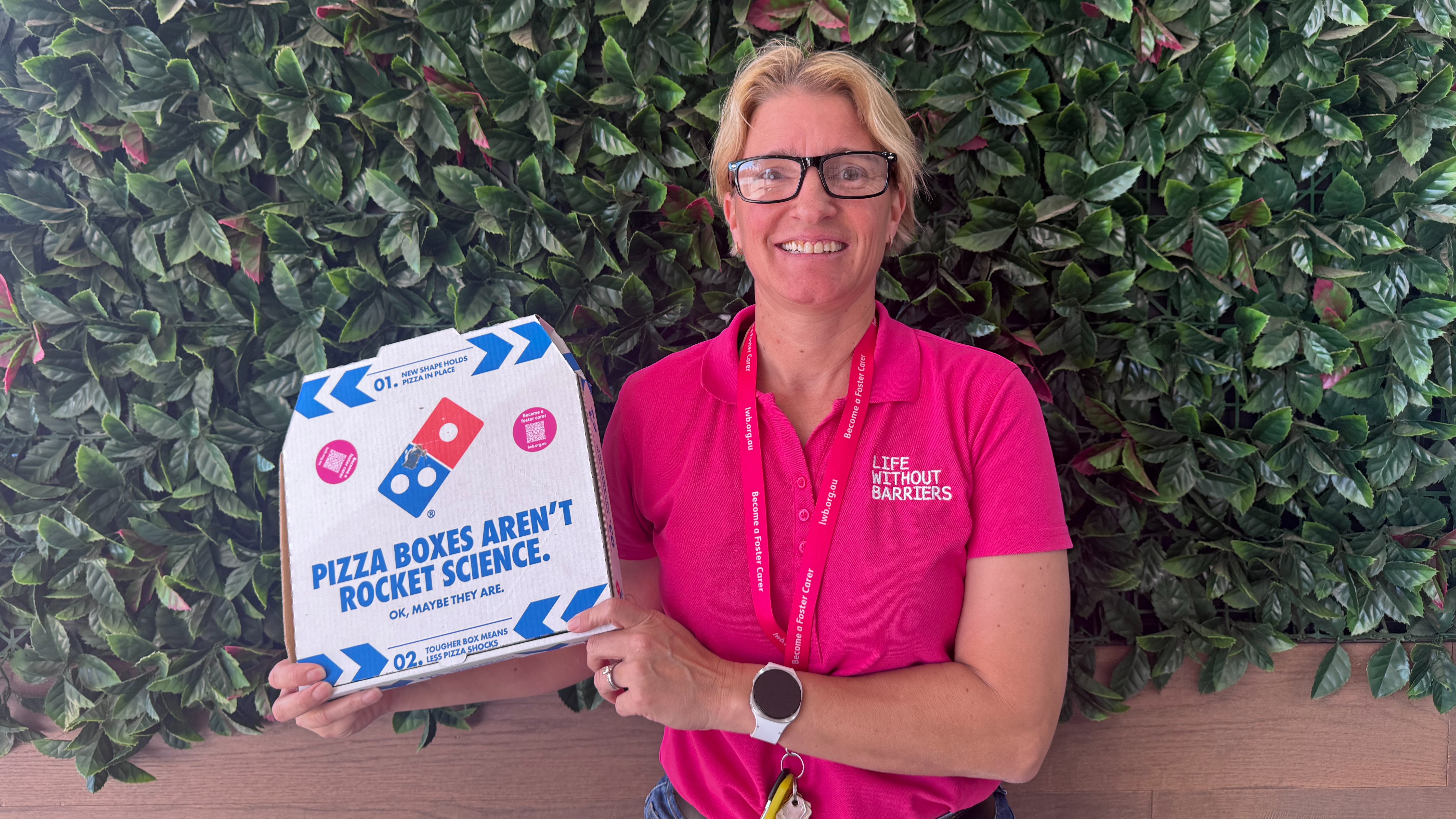 Image: Louise wearing a pink Life Without Barriers t-shirt holds up a pizza box with Sharing is Caring stickers.