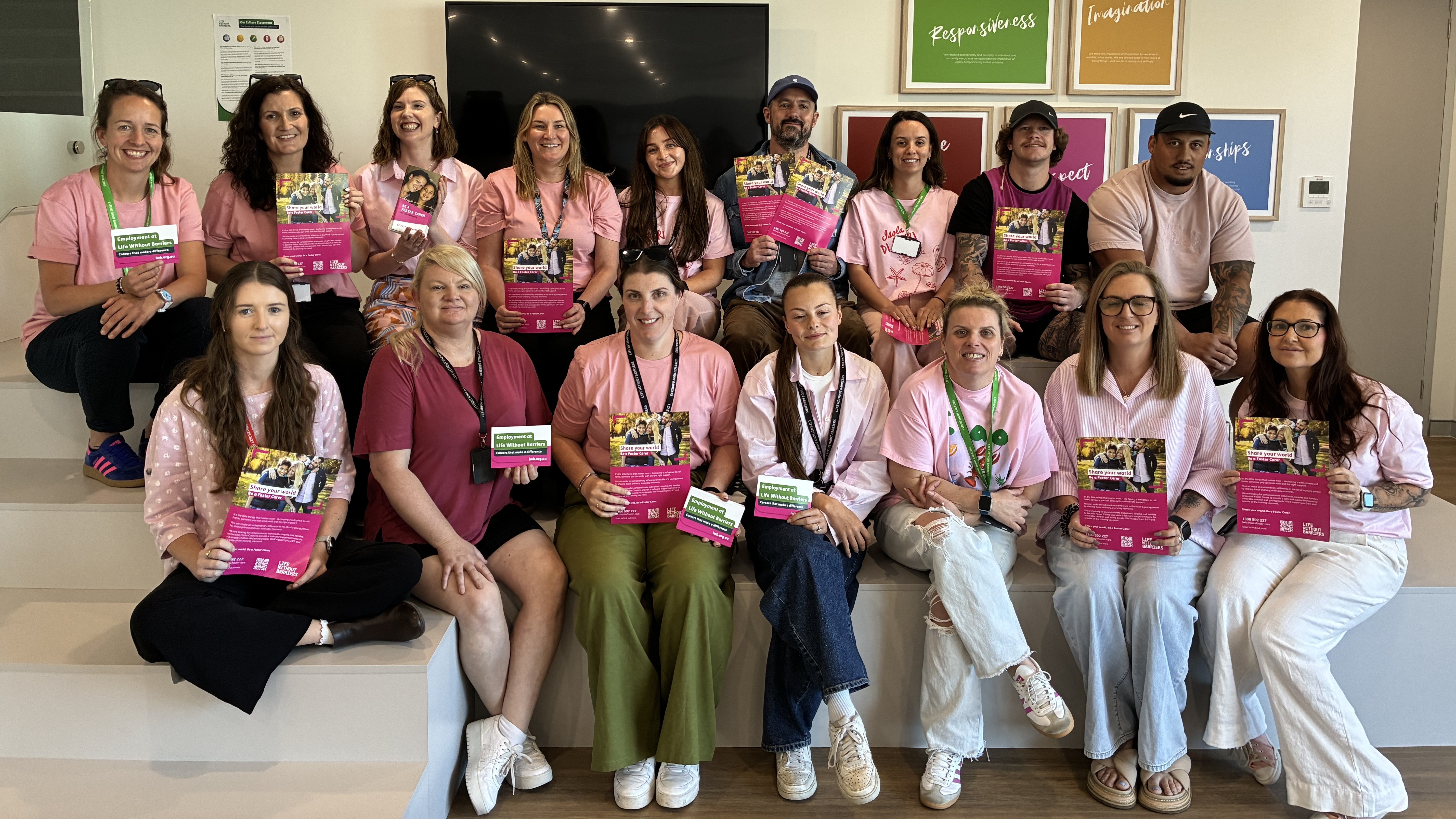 Image: Life Without Barriers Newcastle team wearing pink and holding up 'Sharing is Caring' flyers.