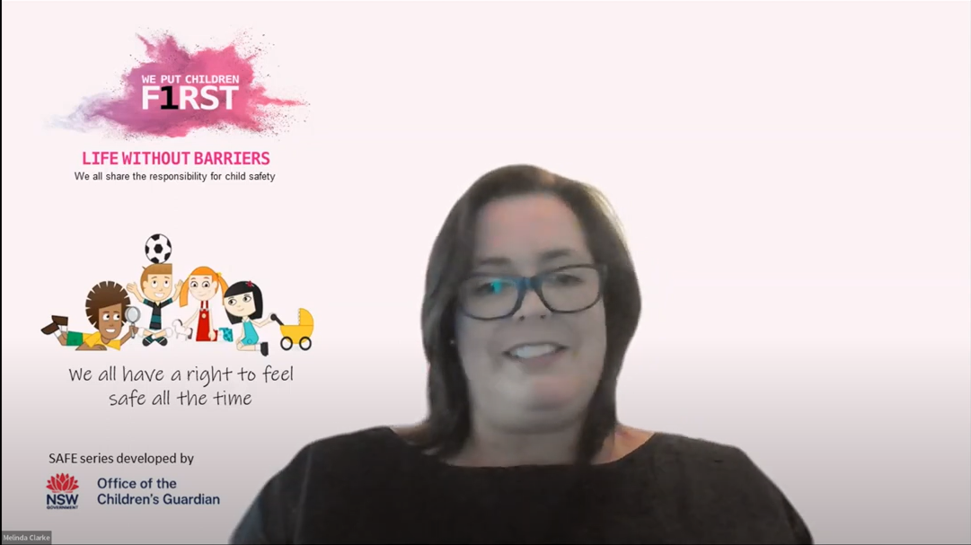 Image: Melinda is presenting on screen. She is wearing a black top and glasses. Behind her is the Life Without Barriers' logo, a cartoon of four children, and the office of the Childrens Guardian logo.