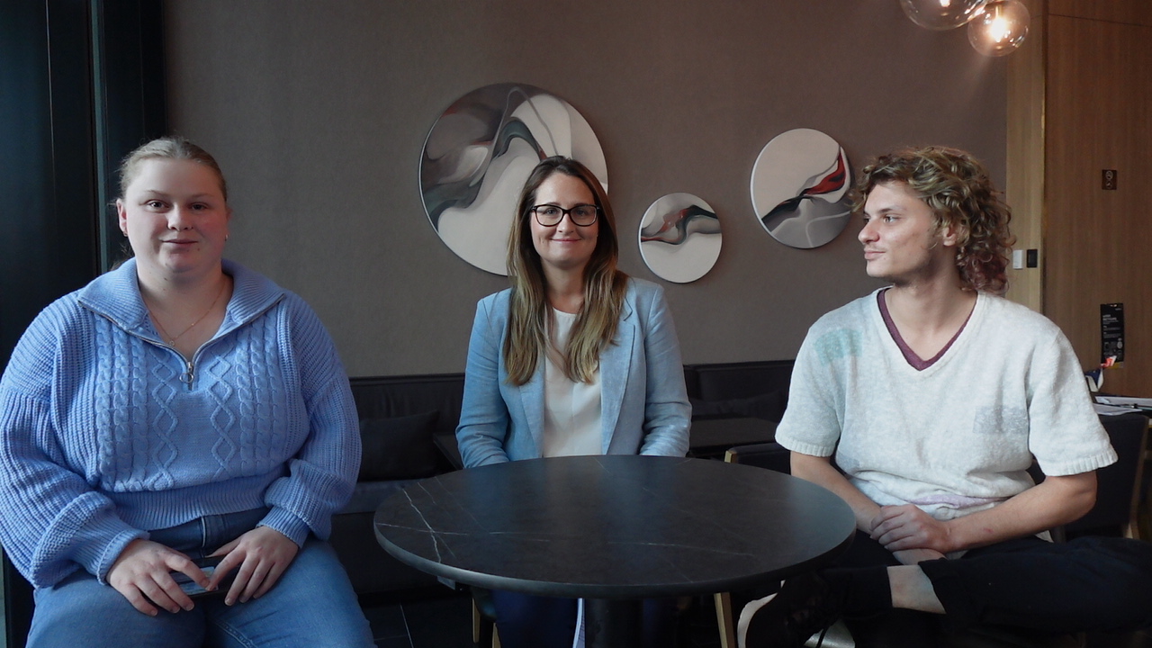 Image: Tara, Carly and Toby sit together at a high table.