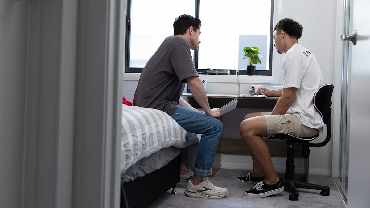 Image: A young person works on a computer at his bedroom’s desk as his youth worker watches on.