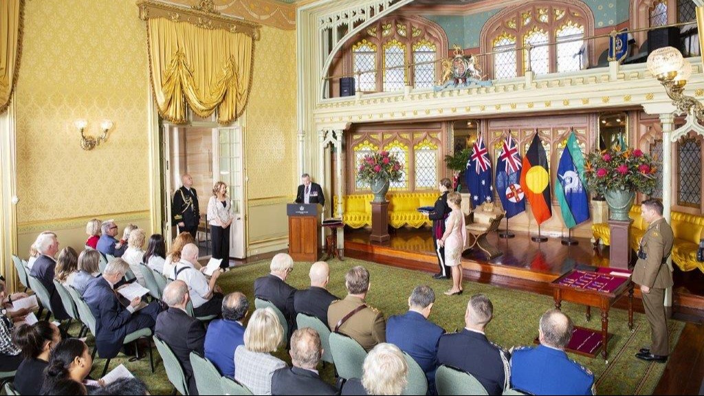 Image: Vanessa stands at the front of an audience, waiting to cross the stage, at the Order of Australia Medal ceremony in 2023.
