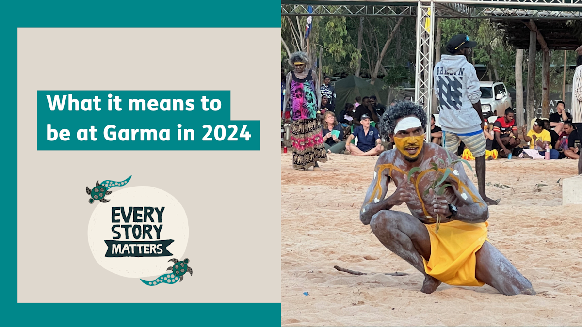Image: Cedrick Marika wearing body paint and yellow material performing at the 2024 Garma Festival. Text: What it means to be at Garma in 2024. Every Story Matters - Logo.