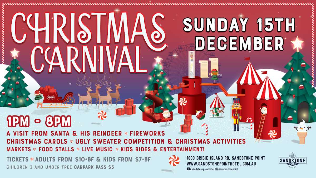 Image: Graphic banner with Christmas trees, reindeer, presents and Santa. Text: Christmas Carnival. Sunday 15th December. 1pm - 8pm.
