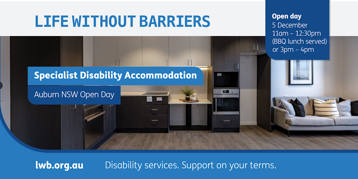 Image: Landscape of the Auburn apartment with text: Specialist Disability Accommodation. Auburn NSW Open Day. 5 December. 11am - 12:30pm or 3pm - 4pm.