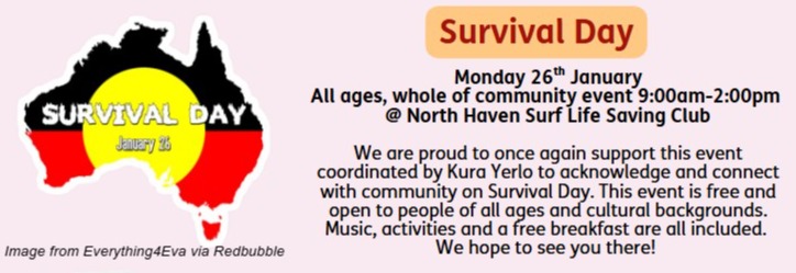 Image: Graphic tile with a pink background, a image of the map of Australia with the colours of the Aboriginal flag. Text: Survival Day. Monday 26th January. All ages, whole of community event 9:00am-2:00pm @ North Haven Surf Life Saving Club.