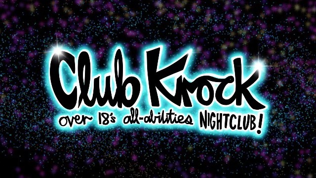 Image: Graphic tile with a dark glittery background. Text: Club Krock. Over 18's all-abilities nightclub!
