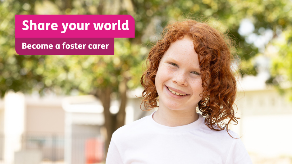 Image: A young boy with curly red hair smiles at the camera. Text: Share your world. Become a foster carer.