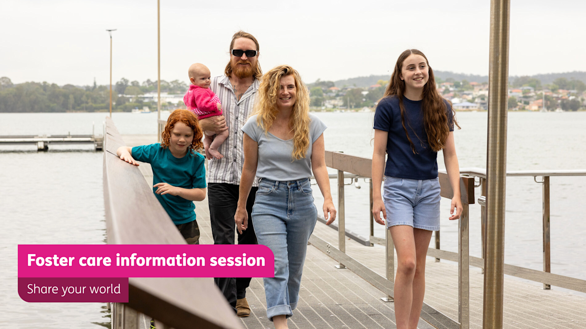 Image: A foster care family walking on a pier. Text: Foster care information session. Share your world.