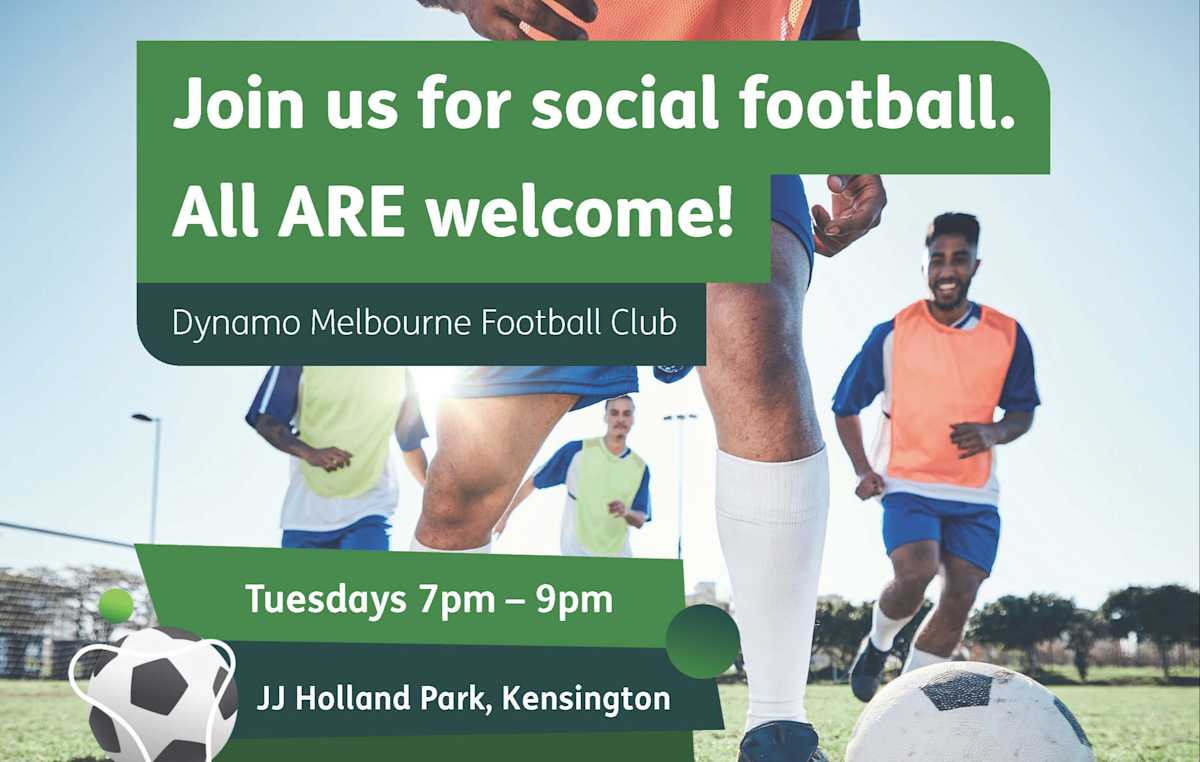 Image: People playing soccer, text on screen reads 'Join us for social football. All are welcome! Dynamo Melbourne Football Club, Tuesdays 7pm - 9pm, JJ Holland Park, Kensington.
