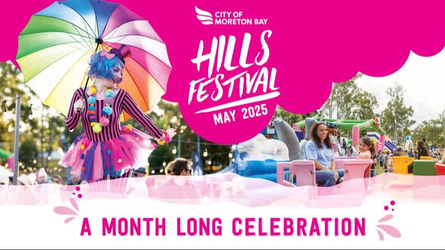 Image: An individual holds a rainbow umbrella, dressed as a clown. In the background people sit on amusement park rides. Text: Hills Festival, May 2025. A month long celebration. City of Moreton Bay - Logo.