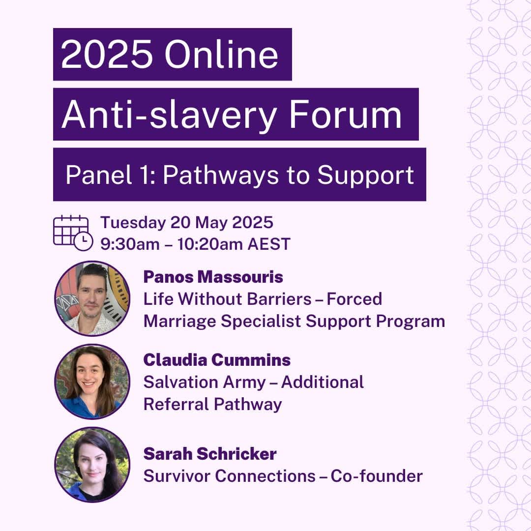 Image: Graphic tile with a light purple background and photos of panelists in circle frames under a body of text. Text: 2025 Online Anti-slavery Forum. Panel 1: Pathways to Support. Tuesday 20 May 2025. 9:30am - 10:20am AEST. Panos Massouris, Life Without Barriers – Forced Marriage Specialist Support Program. Claudia Cummins, Salvation Army – Additional Referral Pathway. Sarah Schricker, Survivor Connections – Co-founder.