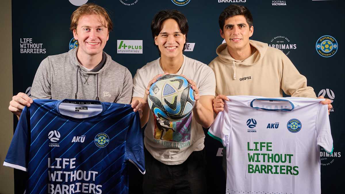 Image: Three Dynamo Melbourne FC players; Jack, Joshua and Sebastián, holding up t-shirts with the Life Without Barriers logo on them.