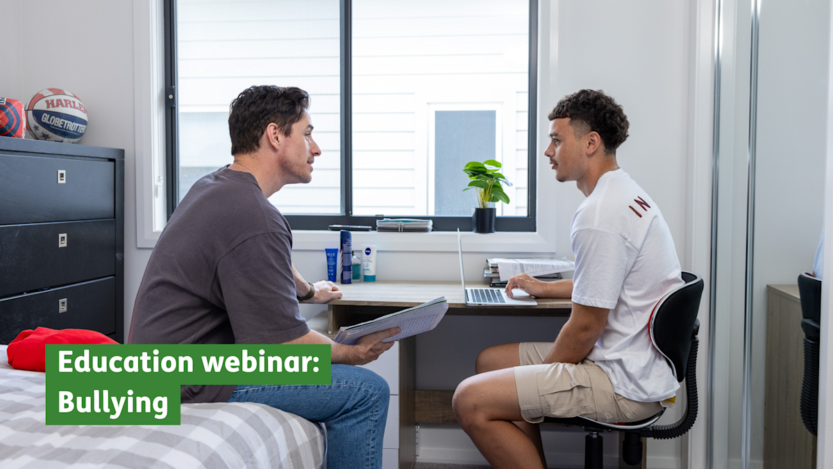 Image: A teenage boy sits at his desk in his bedroom, talking to his father. Text: Education webinar: Bullying.