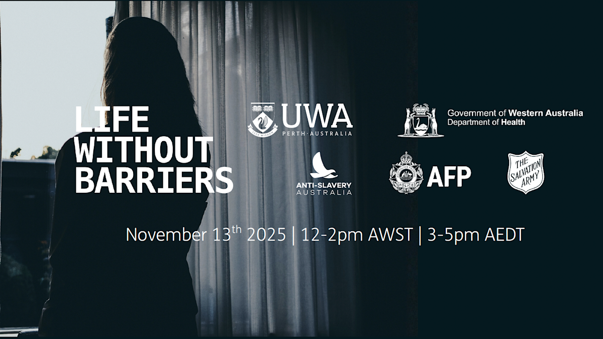 Image: A woman stands at a window with her back to the camera. Text: November 13th 2025. 12-2pm AWST. 3-5pm AEDT. Life Without Barriers - Logo. UWA - Logo. Government of Western Australia Department of Health - Logo. Anti-Slavery Australia - Logo. AFP - Logo. The Salvation Army - Logo.