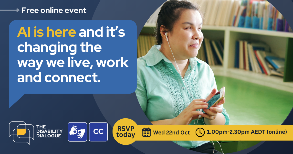 Image: Graphic tile with an image of a woman holding a mobile phone. Text: Free online event. AI is here and it's changing the way we live, work and connect. RSVP today. Wed 22nd Oct. 1.00pm-2:30pm AEDT (online). The Disability Dialogue - Logo. Auslan icon. Closed captions icon.