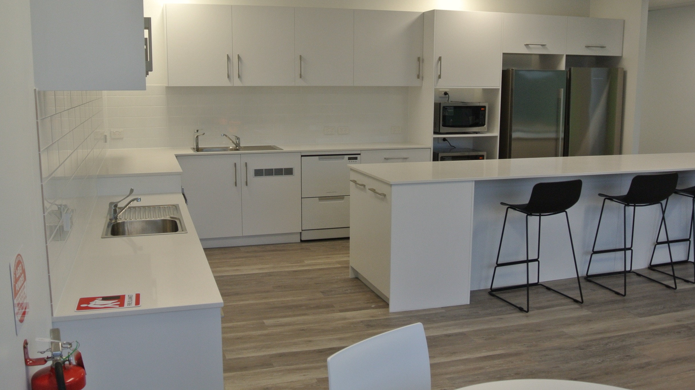Image: Accessible kitchens in our Unley, SA office with lower bench/sink heights and microwaves at two levels.